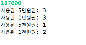 식당에서 밥을 먹고 카운터에서 결제를 하려고 한다. 지갑에는 지폐 5만원권, 1만원권, 5천원권, 천원권이 있는데, 지폐 수량을 최소로 지불하는 방법을 찾고자 한다. 예를 들면, 총 결제 금액이 187,000이 나왔는데 어떻게 하면 지폐 수량을 최소로 지불할 수 있을까?