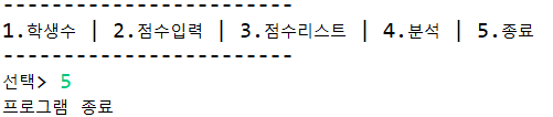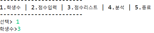 System.out.println("1.학생수 | 2.점수입력 | 3.점수리스트 | 4.분석 | 5.종료");