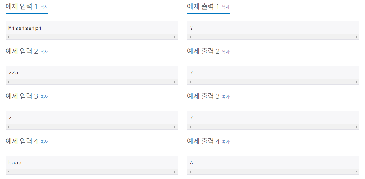 첫째 줄에 이 단어에서 가장 많이 사용된 알파벳을 대문자로 출력한다. 단, 가장 많이 사용된 알파벳이 여러 개 존재하는 경우에는 ?를 출력한다.