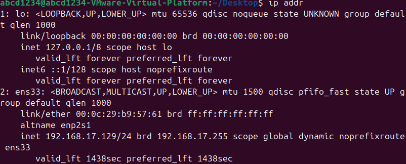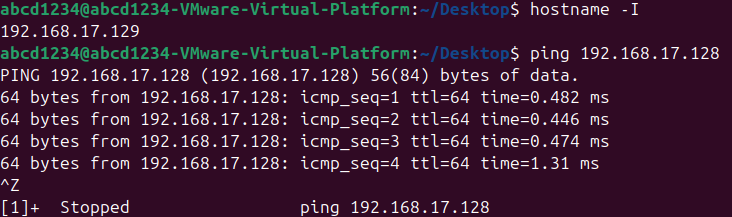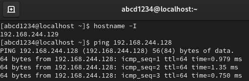VM1의 IP는 192.168.244.128 로 설정이 되어있고 사전에 만들었던 VM2(192.168.244.129 )에 핑을 보내보면 다음과 같이 정상적으로 통신이 되는것을 확인 할 수 있다.