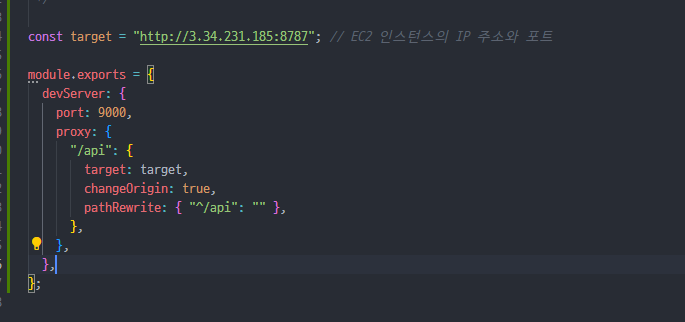 target: target --> 프록시 요청이 전달될 백엔드 서버의 URL을 지정했음. 이 경우 http://3.34.231.185:8787