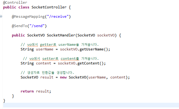 서버 처리: 서버는 클라이언트가 보낸 메시지를 받아 SocketHandler 메서드에서 처리.