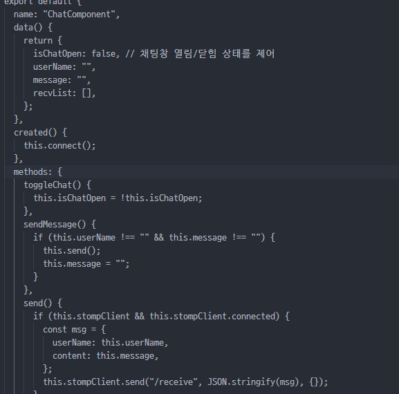 서버 → 클라이언트: 처리된 메시지는 /send 경로로 전송되어, 이를 구독 중인 클라이언트들이 메시지를 수신.