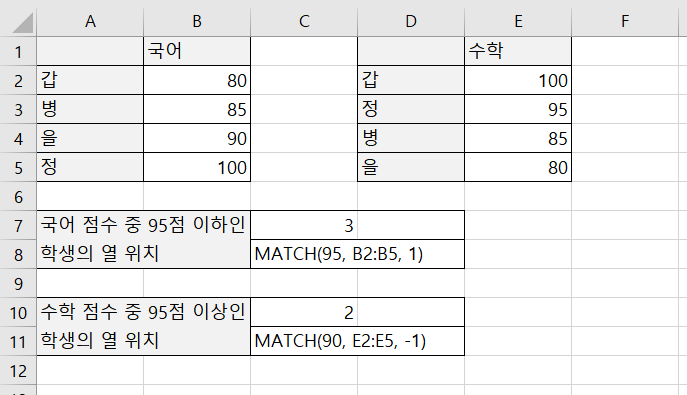 국어 점수가 95점 이하인 학생의 열 위치를 알아보기 위해 우선 국어 점수의 값을 오름차순으로 정렬해야 한다. 그 다음 95점보다 작은 값을 찾아야 하므로 lookup_value에 95를 입력한 뒤 lookup_array는 국어 점수인 "B2:B5" 가 된다. 따라서 =MATCH(95, B2:B5, 1)이 된다. 이 때 함수의 출력값이 왜 3이냐면, 95보다 작거나 같은 값 중 가장 큰 값인 90점이 출력되기 때문이다.